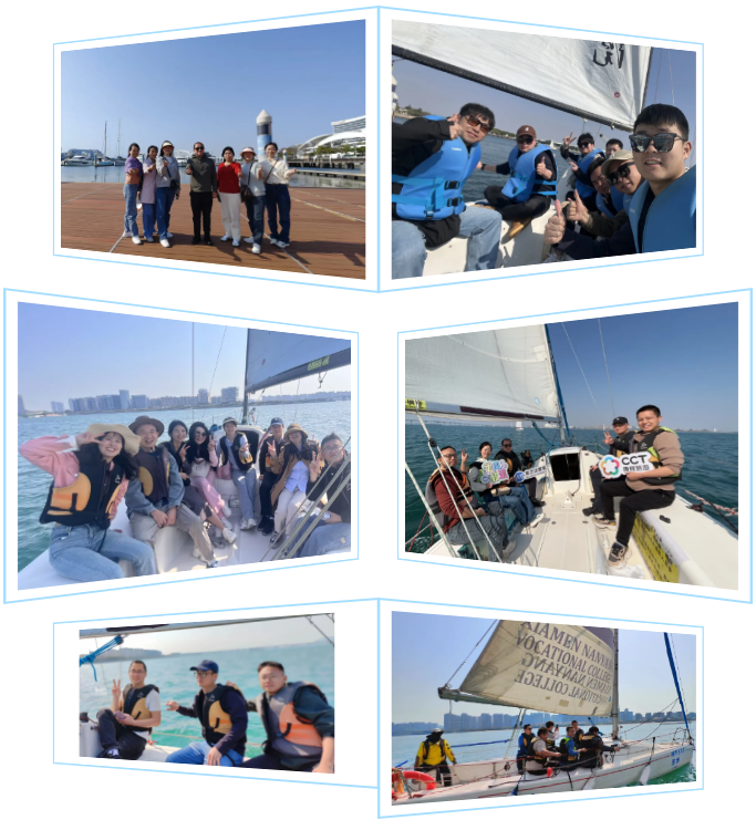 结束了在集美村充实的文化探寻后,我们准备迎接一场充满激情的帆船出海之旅。阳光洒在海面上,波光粼粼,一艘艘帆船静静停靠在岸边,仿佛在等待着我们的到来。我们兴奋地登上帆船,海风立刻呼啸着迎面扑来,船帆在风力的作用下高高扬起,船只如离弦之箭,劈开海浪,疾驰前行。